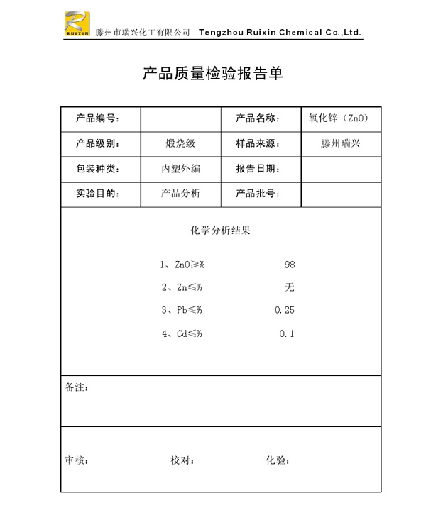 瑞興化工有限公司是生產氧化鋅的重點企業,于2008年通過ISO9001:2008質量管理體系認證。“瑞興”牌氧化鋅在國內擁有較大穩定的市場,并遠銷東南亞、中東、中南美等國家和地區,在國內外享有較高聲譽。